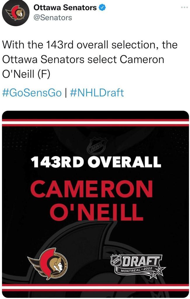 Congratulations to Cameron O'Neill (2004), former MYHA Player, on being drafted by the Ottawa Senators with the 143rd pick of the 2022 NHL Draft. MYHA wishes you the best of luck.